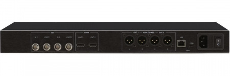 Двухканальный масштабатор 12G-SDI в HDMI 4K/60 (4:4:4) с деэмбеддерами балансного стереоаудио и проходными выходами SDI.