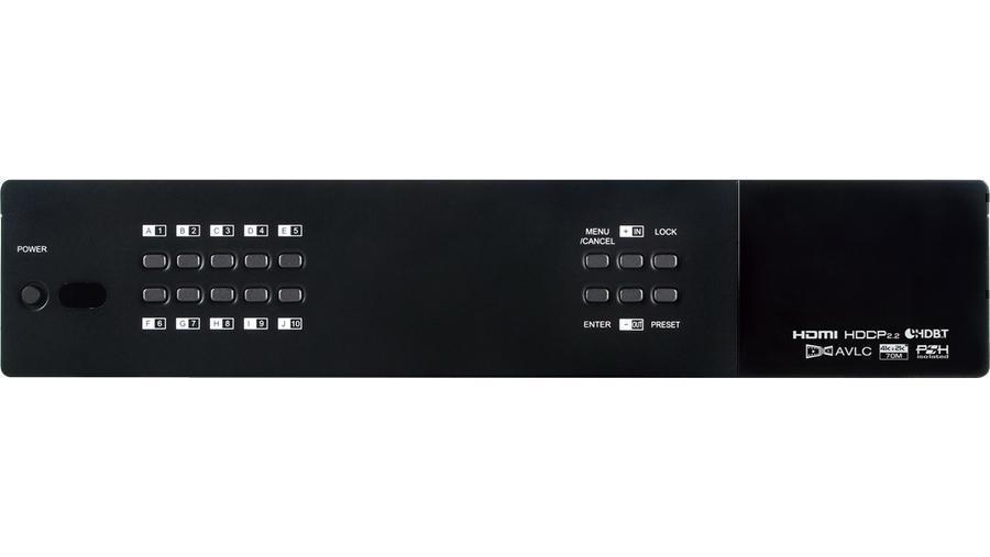 Матричный коммутатор 10х10 HDMI 2.0 UHD 4K (YUV 4:4:4 – 4096x2160/60, на выходах HDMI: 4096x2160/60, HDBaseT: YUV 4:2:0 – 4K/60, 3D) с HDCP 1.4/2.2 и расширенным EDID, полоса пропускания 600 МГц, входы 10 х HDMI + выходы ИК (10х miniJack 3,5 мм), выходы 2 х HDMI, 8 х HDBaseT c PoH 48 В + входы ИК (8х miniJack 3,5 мм), общий ИК (2х miniJack 3,5 мм) для HDBaseT, расстояние до 100 м – 4K. 8 зональных аудиовыхода (2 х RCA) для HDBaseT + 4 дополнительных, 4 аудиовхода (2 х RCA), 2 входа цифрового аудио LPCM 2.0 (TOSLINK + RCA), управление по ИК, RS-232 и IP (Telnet и web-интерфейс). Полоса пропускания 600 МГц, Совместимый приемник: CH-1529RXV.