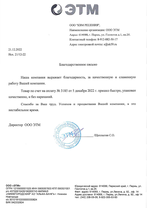 Компания АО «ПИК ПРОГРЕСС» выражает глубокую признательность и искреннюю благодарность компании ООО "КВМ Решения" за качественную и своевременную поставку оборудования. Отгрузка вашей продукции обеспечила бесперебойную работу нашей компании и позволила избежать задержек в производственном процессе.